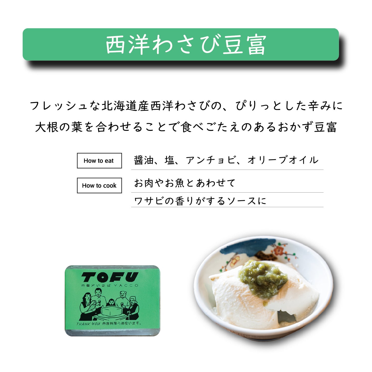 特徴:フレッシュな北海道産西洋わさびの、ぴりっとした辛みに大根の葉をあわせることで食べごたえのあるおかず豆富